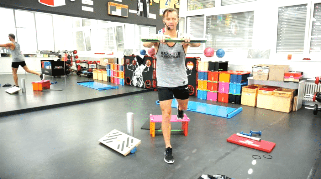 Vertikale Position, Stabilisation (Hüft-, Knie- & Sprunggelenk) & Kräftigung (Beine) der unteren Extremitäten, Rumpfstabilisation, neuromuskuläre Koordination, Koordinationsfähigkeit, Kraftausdauer, Verbesserung der Körperwahrnehmung. Vorausgehende Elemente für eine unproblematische Durchführung beim AS sind die Elemente Ba, Bk-Ba, SG. Der Ausfallschritt dient vor allem dem Kraftzuwachs der unteren Extremitäten, durch den Einsatz der WZ und Unterlagen wird zu dem der gesamte Bewegungsapparat vielseitig gefordert. Ein effektives jedoch auch anstrengedes Element! |