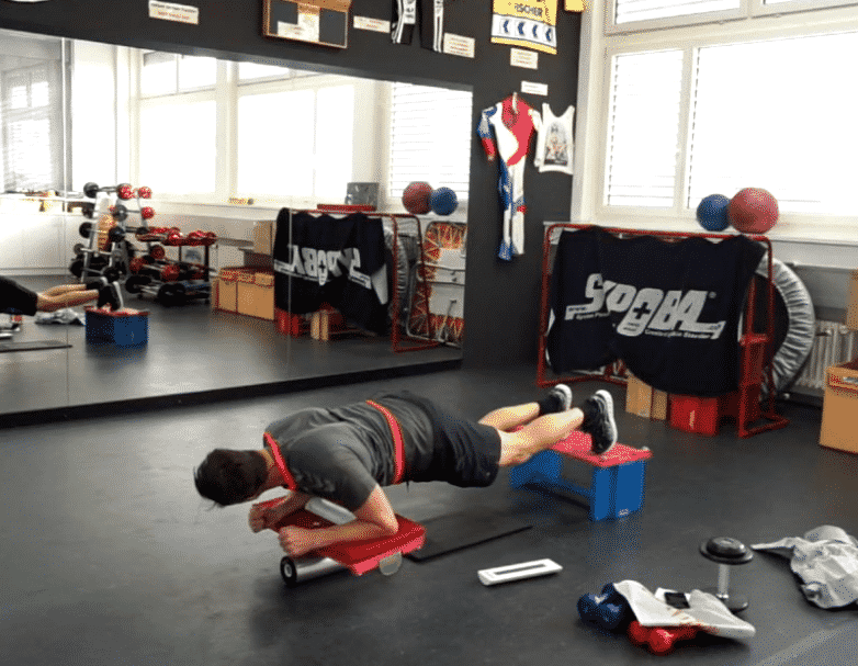 Die BS-3D ist die Erweiterung des Königselement der horizontalen Position, welches eine Ganzkörperspannung & Kräftigung der vorderen Muskelkette (Schultergürtels), der Rumpfstabilisation & oberer sowie mittlerer Rückenpartie. Jedoch das Besondere an der BS-3D (Zauberstab – Stab liegt auf der Rolle) ist diese Rotation damit verschiebt sich der muskuläre Schwerpunkt auf den Trizeps. Des Weiteren führt dieses Element zu einer Verbesserung der Körperwahrnehmung, symmetrische Muskelaktivierung und Vermeidung muskulärer Dysbalancen. Nicht zuletzt fordert dieses Element auch die Willenspannkraft. Dieses Element ist die Grundlage für viele Weitere horizontale Elemente. Hinzu kommen wie bei allen anderen Elementen die progressiven Werkzeuge, hierbei wäre es mit Socken oder das hight light mit dem Seps (Füsse auf dem Step), dadurch erhöht sich noch einmal mehr die Kraft. |