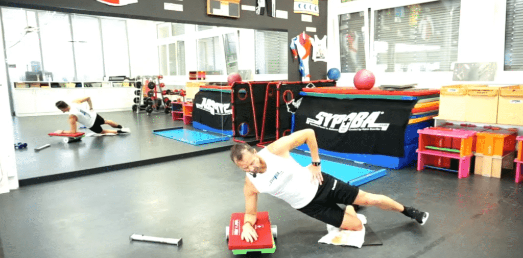 Horizontale Ganzkörperspannung & Kräftigung der seitlichen Muskelkette, Je nach Position = kniend oder gestreckt sind unterschiedliche lokale Muskelpartien welche entsprechend im Vordergrund aktiviert werden. Kniend wird vor allem die seitliche Bein- und Gesässmuskulatur stabilisiert & gekräftigt. In gestreckter Lage wird die gesamte seitliche Beinachse (vor allem Knie- & Sprungkelenk) stabilisiert & gekräftigt. Voraussetzung für die BS-s ist eine gute Basis bei der BS-frontal und gut geschulte Schultern. |