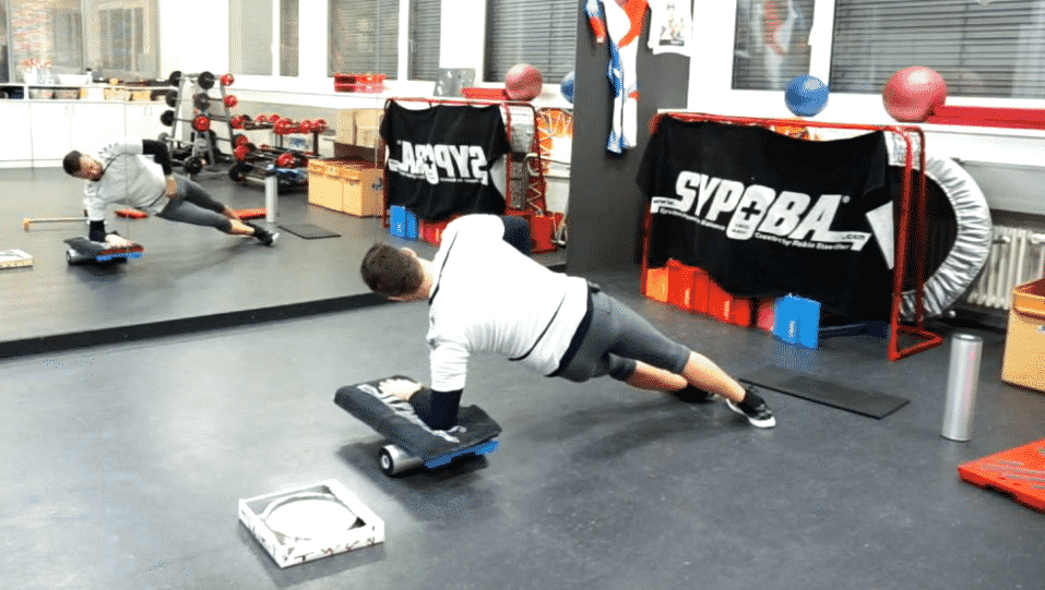 Horizontale Ganzkörperspannung & Kräftigung der seitlichen Muskelkette, In gestreckter Lage wird die gesamte seitliche Beinachse (vor allem Knie- & Sprungkelenk) stabilisiert & gekräftigt. Der wesentliche Unterschied für eine hohe Effizienz ist die Durchführung mit dem SYPOBA® (Rolle Board), da auf fixer Lage die Schultern nicht annähernd dem geschult und gekräftigt werden! Wichtig dabei, dass das Board mit der Hand nicht festgehalten wird, entsprechend erfolgt direkt eine Rückmeldung ob die Balance noch gehalten werden kann oder nicht! Weitere interessante und effiziente Bereiche sind die Werkzeuge! Je nach Wahl der Werkzeuge erhöht sich die gesamte neuromuskuläre Intensittät um ein vielfaches. Zuvor wurde der Unterschied zwischen fixem Bodenkontakt und SYPOBA® (Rolle Board) kurz erklärt, im Bereich der Unteramposition. Führt man die Bs-s-ges mit gestrecktem Arm durch, verändern sich die Kräfte im Gegensatz zur SYPOBA® Anwendung, d.h. mit dem gestreckten Arm werden zwei Gelenke mehr eingebunden (Ellenbogen- & Handgelenk), entsprechend verteilt sich die Belastung von einem, auf 3 Gelenke. Tönt im Grunde nach Enlastung, ist es aber nicht, deswegen empfiehlt SYPOBA® eine fundierte Grundlage mit Rolle/Board bevor man auf die nächste höhere Stufe begibt. Beginnt man zu früh zu belasten entstehen aufkommende Schmerzen im Ellenbogen und Handgelenk. |