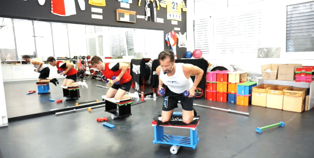 R-kn gehört zur vertikalen Position dank der knienden Position lässt sich dieses Element sehr rasch und mit jedem TN einfach umsetzen. Durch dieses Element wird nicht nur der Rücken stark verbessert, sondern auch dessen Hüfte – somit ein MUSS für jeden TN, da die Hüfte im Alltag (je nach Tätigkeit & Sport) sehr stark aber auch sehr wenig belastet wird! Des Weiteren Dank der Variation der Werkzeuge ist dieses Element eines der vielseitigsten Elemente ob Richtung Koordination oder Kräftigung. Im Professional Level kommen weitere Faktoren hinzu, die es ermöglichen Muskelpartien zu trainieren, die auf den unteren Levels nicht denkbar ist, da die Grundlage (Neuromuskulär) bei den Teilnehmern nicht vorhanden ist. Dieser Wechsel auf diesem Niveau ist effektiv eine Herausforderung aber auch extrem beglückend, da man nicht nur weiss, sondern auch die positive Differenz seiner Entwicklung spürt! |