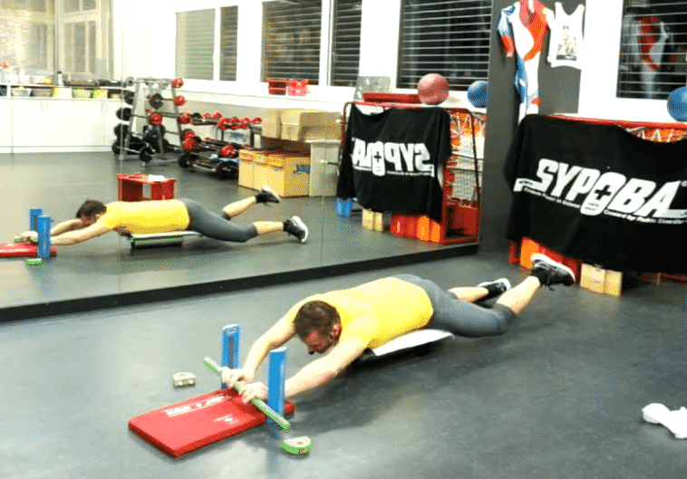 Horizontale Ganzkörperspannung & Kräftigung der gesamten Rückenmuskulatur & obere Extremitäten (Schulter, z.T. Arme), Kräftigung der hinteren Muskelketten, Rumpfstabilisation, Stützkraft, lokale Kräftigung der oberen Rückenmuskulatur, neuromuskluäre Koordination, Kraftausdauer, Verbesserung der Körperwahrnehmung, Vermeidung muskulärer Dysbalancen. Dieses Element gehört mitunter (Ba-st) zur erster Wahl bei Teilnehmer mit Rückenproblemen – entsprechend kann die Intensität relativ schnell erhöht werden ohne dass die Wirbelsäule zusätzliche Belastungen entgegennhemen muss – es ist das einzige Element wo der untere Rücken (bei korrekter Haltung) nicht belastet wird – allerdings NUR bei Benützung von Rolle & Board!!! Über die weiteren neuen WZ im Professional last sich die Belastung im mukulären Bereich deuttlich steigern. |