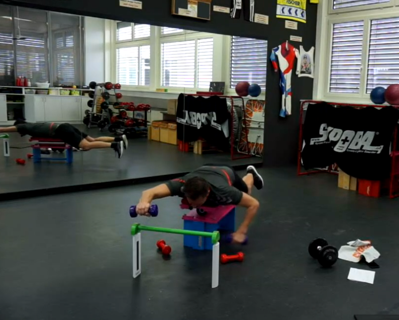 Horizontale Ganzkörperspannung & Kräftigung der gesamten Rückenmuskulatur & obere Extremitäten (Schulter, z.T. Arme), Kräftigung der hinteren Muskelketten, Rumpfstabilisation, Stützkraft, lokale Kräftigung der oberen Rückenmuskulatur, neuromuskluäre Koordination, Kraftausdauer, Verbesserung der Körperwahrnehmung, Vermeidung muskulärer Dysbalancen. Dieses Element gehört mitunter (Ba-st) zur erster Wahl bei Teilnehmer mit Rückenproblemen – entsprechend kann die Intensität relativ schnell erhöht werden ohne dass die Wirbelsäule zusätzliche Belastungen entgegen nehmen muss – es ist das einzige Element wo der untere Rücken (bei korrekter Haltung) nicht belastet wird – allerdings NUR bei Benützung von Rolle & Board!!!