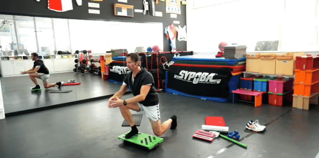 Vertikale Position, Stabilisation (Hüft-, Knie- & Sprunggelenk) & Kräftigung (Beine) der unteren Extremitäten, Rumpfstabilisation, neuromuskuläre Koordination, Koordinationsfähigkeit, Kraftausdauer, Verbesserung der Körperwahrnehmung. Vorausgehende Elemente für eine unproblematische Durchführung beim AS sind die Elemente Ba, Bk-Ba, SG. Der Ausfallschritt dient vor allem dem Kraftzuwachs der unteren Extremitäten, durch den Einsatz der WZ und Unterlagen wird zu dem der gesamte Bewegungsapparat vielseitig gefordert. Ein effektives jedoch auch anstrengedes Element! |