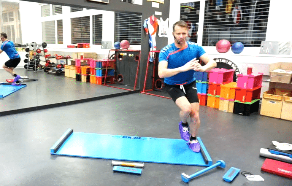 Die Beinkräftigung auf dem Sliding Board ist ein vielseitiges Element, kombiniert aus den Elementen Ausfallschritt und Beinkräftigung fix und Gatepress®. Des Weiteren kommt das Sliden hinzu was das Herzkreislaufsystem noch erweitert dazu stosst. Durch die Ausfallschrittbewegungen auf der rutschigen Unterlage wird zudem noch gedehnt in der dynamik, was genau der SYPOBA Philosophie entspricht. Ein effektives Element der einem in jeglicher Hinsicht fordert! |