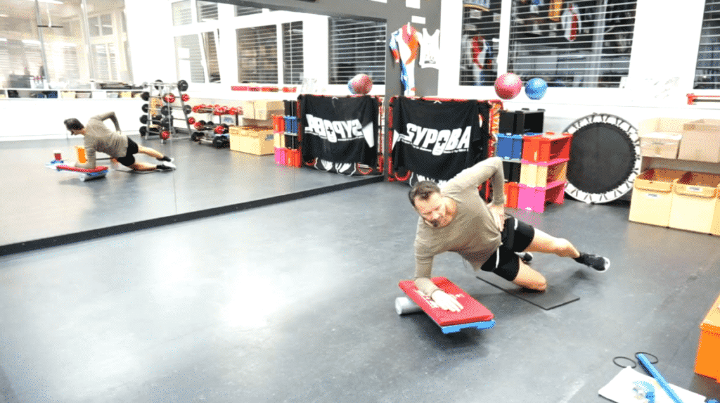 Horizontale Ganzkörperspannung & Kräftigung der seitlichen Muskelkette, Je nach Position = kniend oder gestreckt sind unterschiedliche lokale Muskelpartien welche entsprechend im Vordergrund aktiviert werden. Kniend wird vor allem die seitliche Bein- und Gesässmuskulatur stabilisiert & gekräftigt. In gestreckter Lage wird die gesamte seitliche Beinachse (vor allem Knie- & Sprungkelenk) stabilisiert & gekräftigt. Voraussetzung für die BS-s ist eine gute Basis bei der BS-frontal und gut geschulte Schultern. |