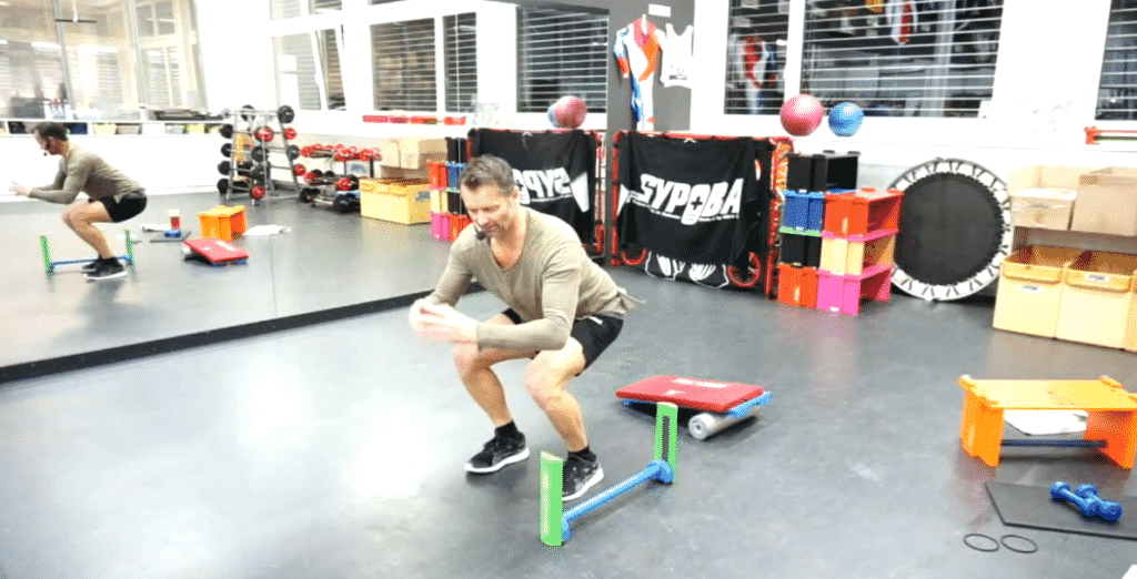 Vertikales Element. Das Cc E gehört zur Gruppe Schnellkraft & Schnellkraftausdauer, um die Belastungen auf die Gelenke zu schonen muss eine Grundlage und Technik angeeignet werden, dafür sorgen die vorgeübten E wie Bk-Ba, AS und dabei besonders die Übung Kniebeuge, welche die technischen Voraussetzungen einleitet. Zu beachten ist, dass der Oberkörper bei der Durchführung stets stabilisiert bleibt – der Schwung SOLL aus den Beinen und nicht über den Oberkörper erfolgen! Allerdings ist der Aufbau entsprechend sanft aufgebaut, so dass zu Beginn KEINE grossen Belastungen auf die Gelenke entstehen, viel mehr ein dynamisches Aktivieren der unteren Extremitäten in Verbindung mit Koordinativen Übungen. |