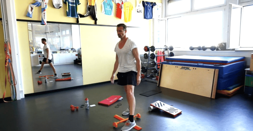 Vertikales Element. Das Cc E gehört zur Gruppe Schnellkraft & Schnellkraftausdauer, um die Belastungen auf die Gelenke zu schonen muss eine Grundlage und Technik angeeignet werden, dafür sorgen die vorgeübten E wie Bk-Ba, AS und dabei besonders die Übung Kniebeuge, welche die technischen Voraussetzungen einleitet. Zu beachten ist, dass der Oberkörper bei der Durchführung stets stabilisiert bleibt – der Schwung SOLL aus den Beinen und nicht über den Oberkörper erfolgen! Allerdings ist der Aufbau entsprechend sanft aufgebaut, so dass zu Beginn KEINE grossen Belastungen auf die Gelenke entstehen, viel mehr ein dynamisches Aktivieren der unteren Extremitäten in Verbindung mit Koordinativen Übungen. |