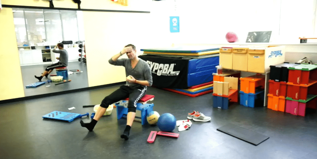 Vertikales Element. Dieses E gehört zur Gruppe Mentale E, d.h. es werden unterschiedliche Formen der Koordination eingebaut und je nach Schwerpunkt werden unterschiedliche Fertigkeiten aufgerufen. Beim Jo-sit wird die gesamt Rumpfmuskulatur stabilisiert & gekräftigt.  Des Weiteren werden über eine zusätzliche Aufgabe im Bereich der oberen Extremitäten die Koordinationsfähigkeiten erweitert, d.h. 2 koordinative Aufgaben gleichzeitig erfüllen! Achtung: Bei Teilnehmer mit Rückenbeschwerden in der LWS – ist Vorsicht geboten – d.h. sobald der TN über die Rumpfstabilität die Haltung nicht mehr aufrechterhalten kann – sollte das Element kurzzeitig abgebrochen werden. Jedoch dient dieses Element auch als Zeichen des Fortschrittes – wenn beim TN diese Beschwerden nicht mehr auftauchen!!!