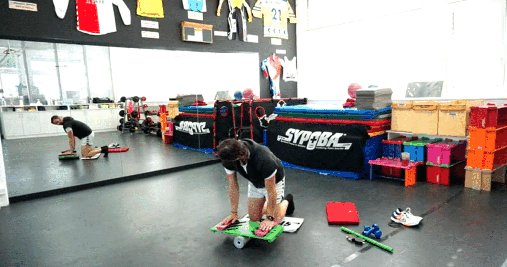 Horizontale Ganzkörperspannung & Kräftigung der vorderen Muskelkette, Rumpfstabilisation, Stützkraft, Stabilisation & Kräftigung des Schultergürtels & der oberen Extremitäten – je nach Reizintensität werden lokal die unteren vorderen Oberschenkel gekräftigt – dank dieser Möglichkeit werden die Patellasehnen ohne grosse Belastung gedehnt und gekräftigt – so dass Patellasehnenentzündungen damit vermieden werden können! Dieses Element ist die Erweiterung des Elements BS aber auch Vorstufe für das Element LS. |