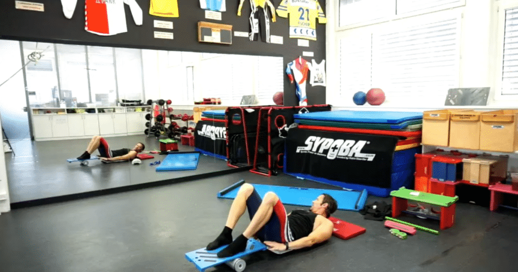 Das Element RGB gehört zur horizontalen Position und ist eines der ältesten Elemente überhaupt. Trotz gewissen positiven „HASS“ – dieses Element zeigt sehr rasch die Grenzen auf = Krämpfe, ist es nach wie vor eines der wichtigsten Element für eine gute Stabilität und Kräftigung der unteren Beuger-Schlinge – resp. im Bereich der Knie. Es gibt kein Gerät oder Übung, welches die gleichen Effekte aufzeigt wie mit Rolle & Board. Das wichtigste dabei ist, dass die Technik entsprechend auch sauber durchgeführt wird! Ausserdem gibt es nur ganz wenige TN bisher, welche dieses Element resp. dessen Übungen 1-beinig ordentlich durchführen können! |