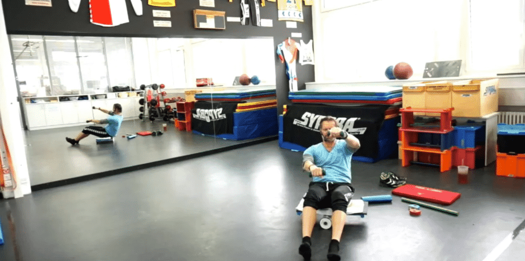 Vertikales Element. Das Element Sh-k-sit befasst in erster Linie um die Beweglichkeit des Schultergelenks und dessen Mobilität. Die Übungen und Dauer (Umfang) des Elements tritt automtisch eine Verbesserung der Schulterstabilität ein – die Dank der unstabilen Lage (Rolle-Board) dazu bewegt. Des Wieteren wird über die sitzende Position die gesamte Rumpfmuskulatur lokal gekräftigt ohne zusätzlichen spezifischen Übungen. Normalerweise im Alltag heist sitzen ausruhen – hier wird das Gegenteil erwartet und dazu noch sehr produktiv! |